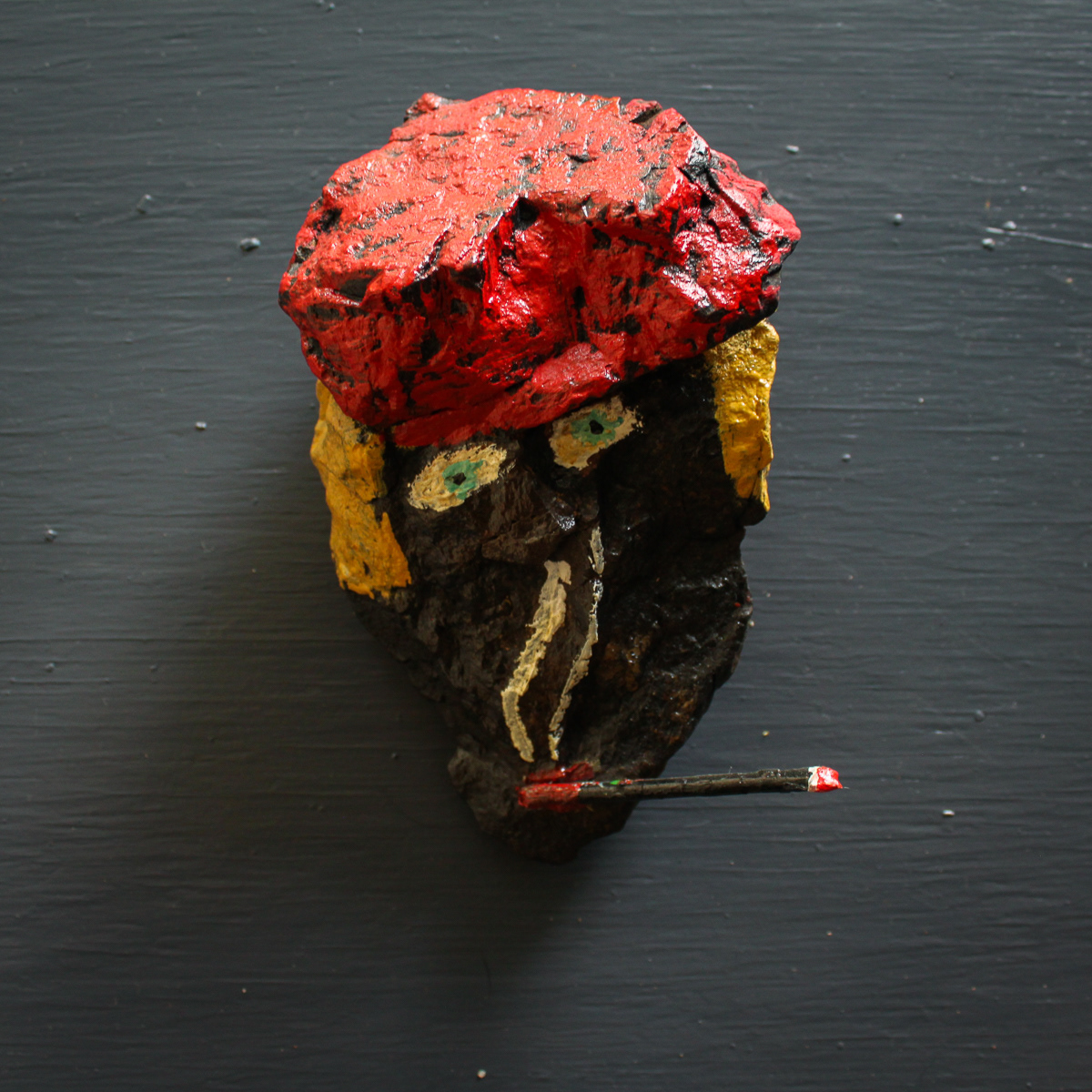 Man in beret smoking, found rock, acrylic, broken paint brush.
