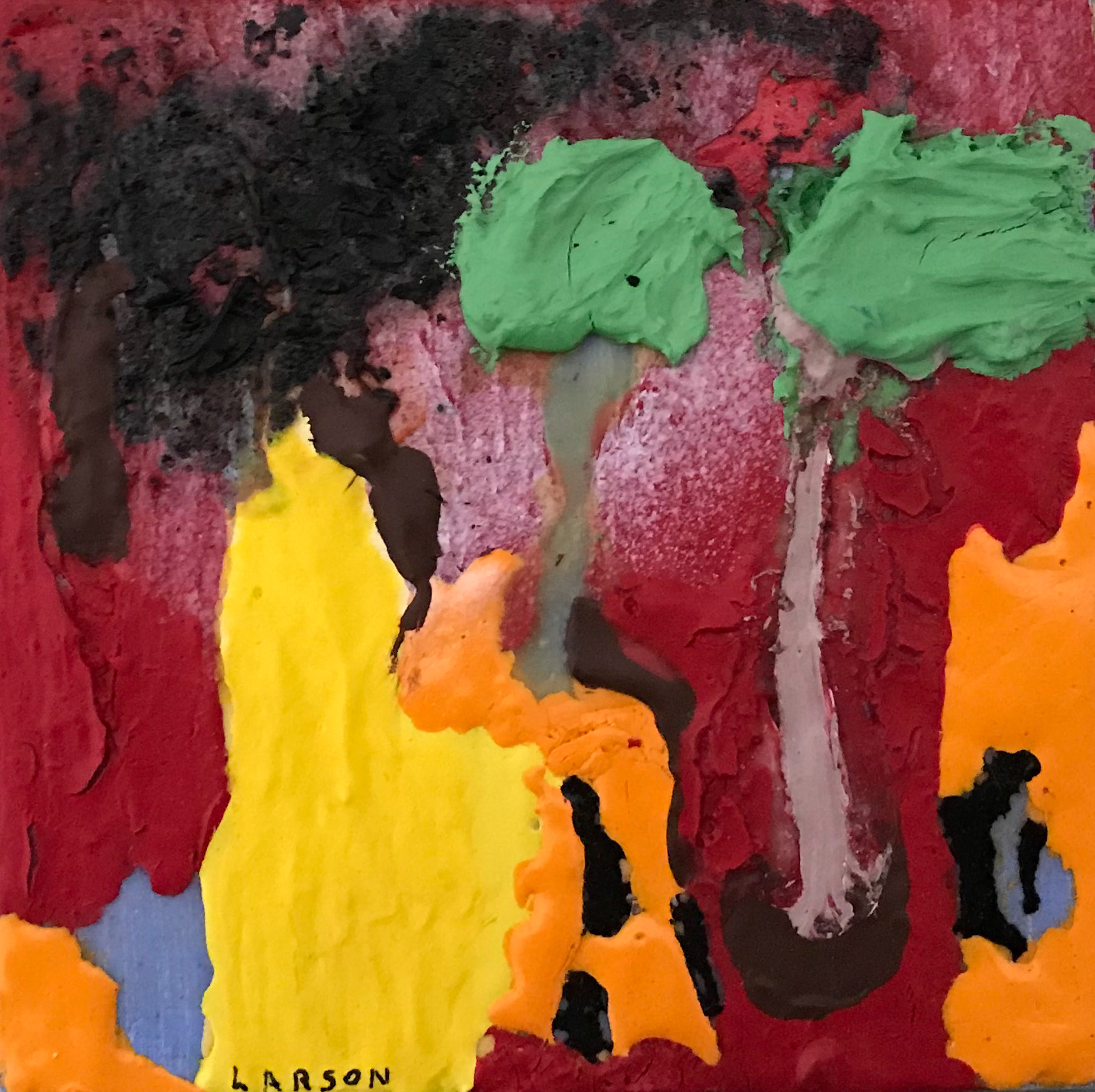 Untitled, charred background ; acrylic, spray pain, wax, glue, plaster, burnt newspaper, 4" X 4"